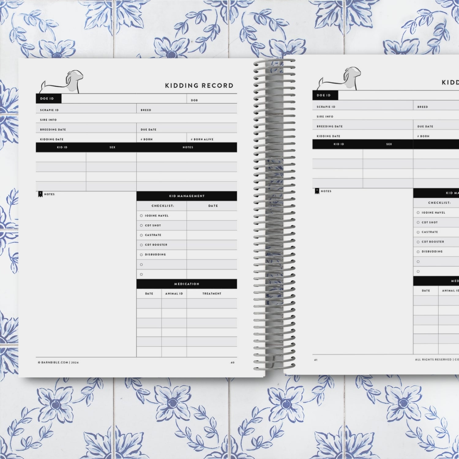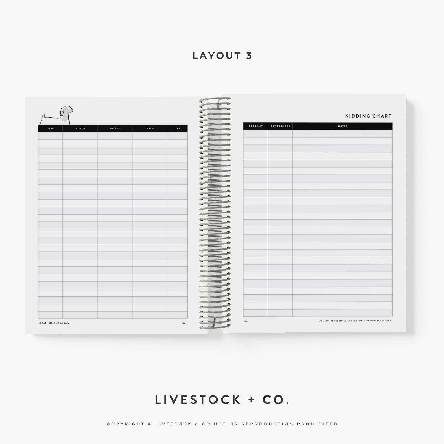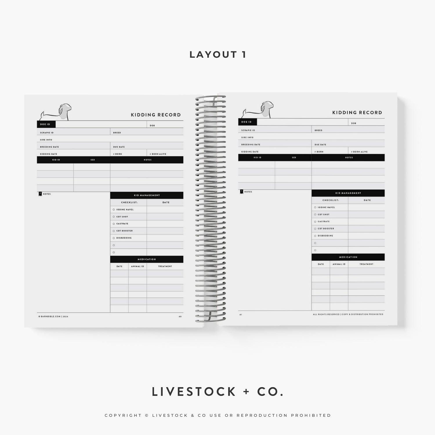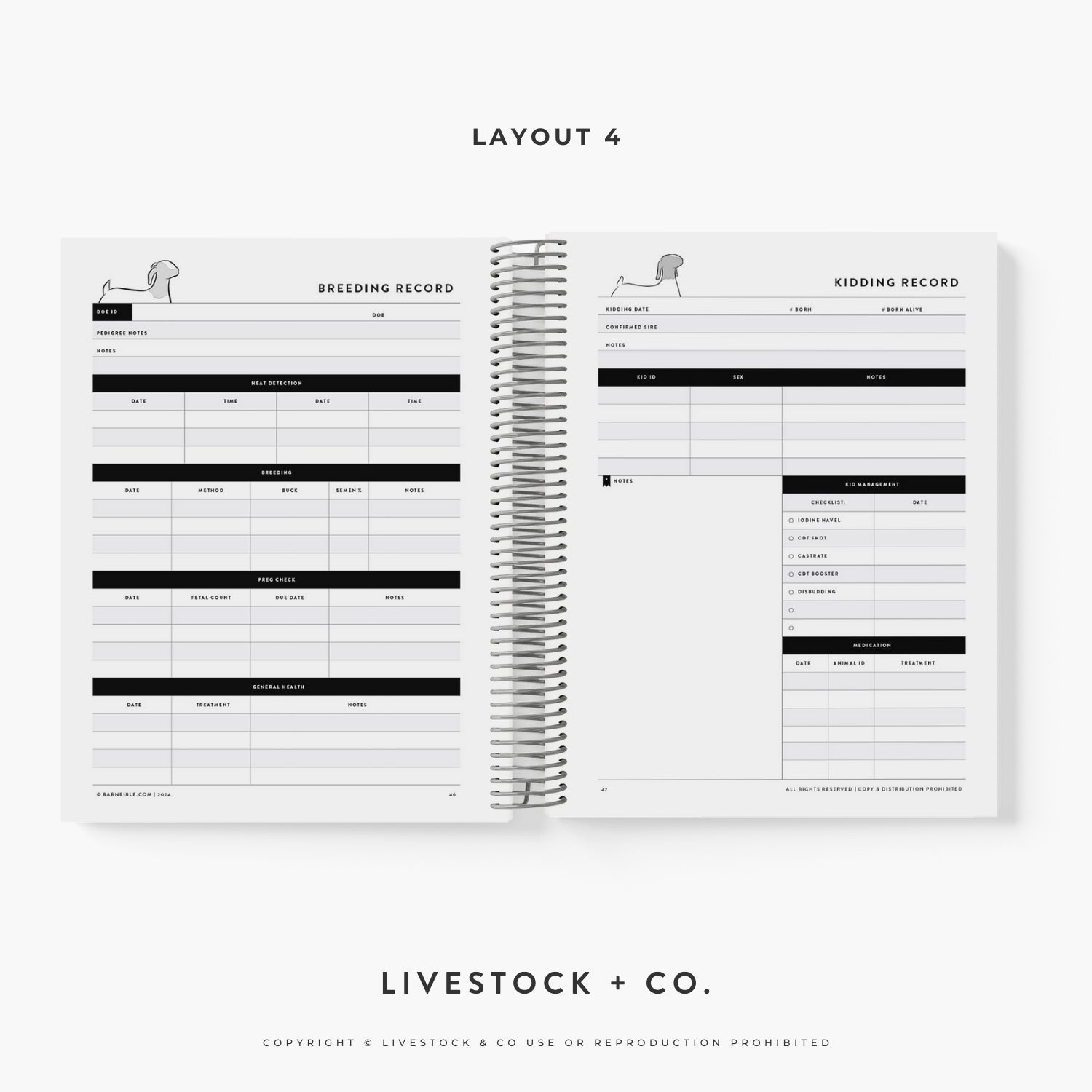 This layout is perfect for goat families who want every detail of each kidding right where they can use it. Track doe information, birth notes, kid stats, and newborn care all on a single spread. With built-in kid-management checklists and a medication log, it’s made for hands-on herds where every birth matters and nothing slips through the cracks.