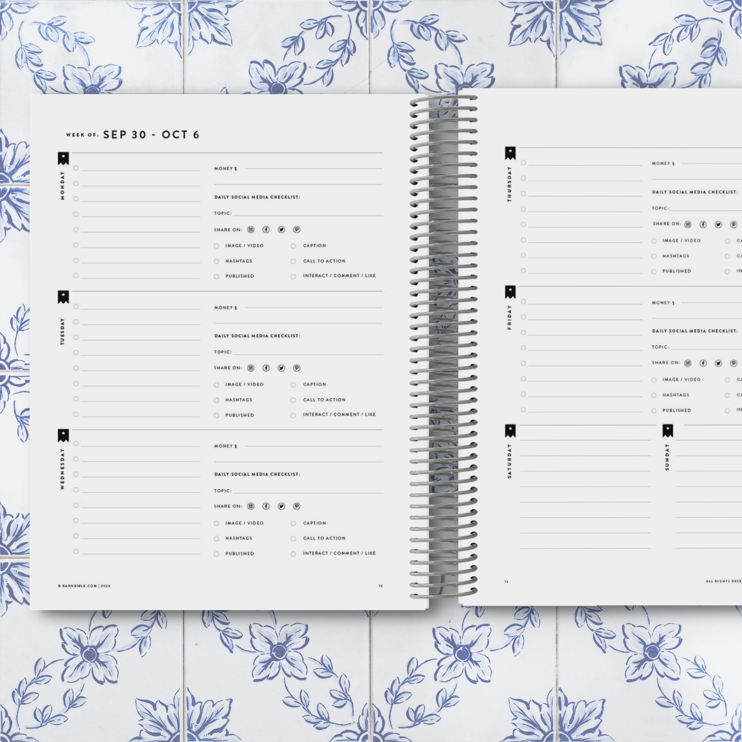 Made for rural makers, boutique owners, and side-hustle moms. This layout includes daily content prompts, posting checklists, and space to track the work that grows your business week after week — without the overwhelm.